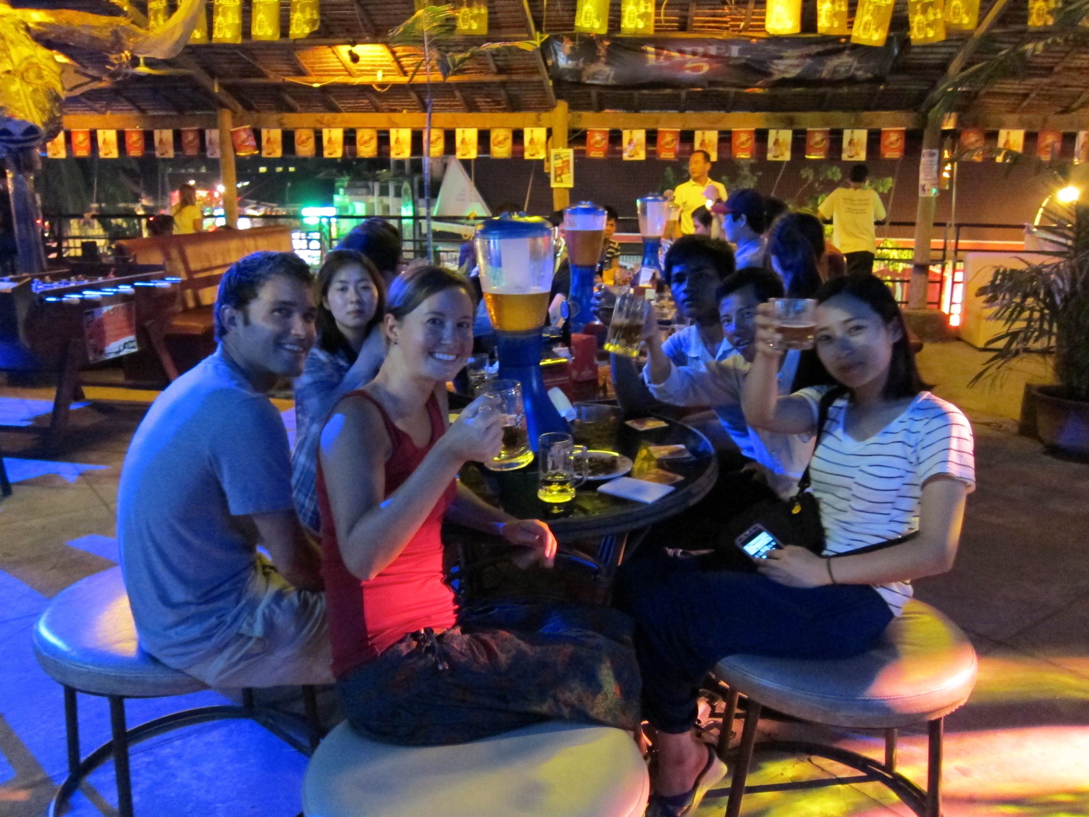 One night we were hanging out at X Bar when we noticed a large, fun-looking group of 20-year old Koreans and a handful of Cambodians hanging out, taking down a serious number of beer towers. An older man in his late 40’s, who seemed to be in charge of the group, wandered over our way and told us that the group was here to volunteer to teach English to kids out in the countryside. He asked us to join the group, so that we could, in turn, help the Korean group practice their English as well (because even though they were teaching it, some of them had only a basic understanding of English). He eventually coaxed us to walk over to the group, where he got everyone’s attention and said, “I just met these nice Americans at the bar; they asked if they could join you.” That wasn’t exactlyhow we remembered the conversation going, but everyone happily made room for us and proceeded to teach us an uncanny number of odd, confusing, and hilarious Korean drinking games.