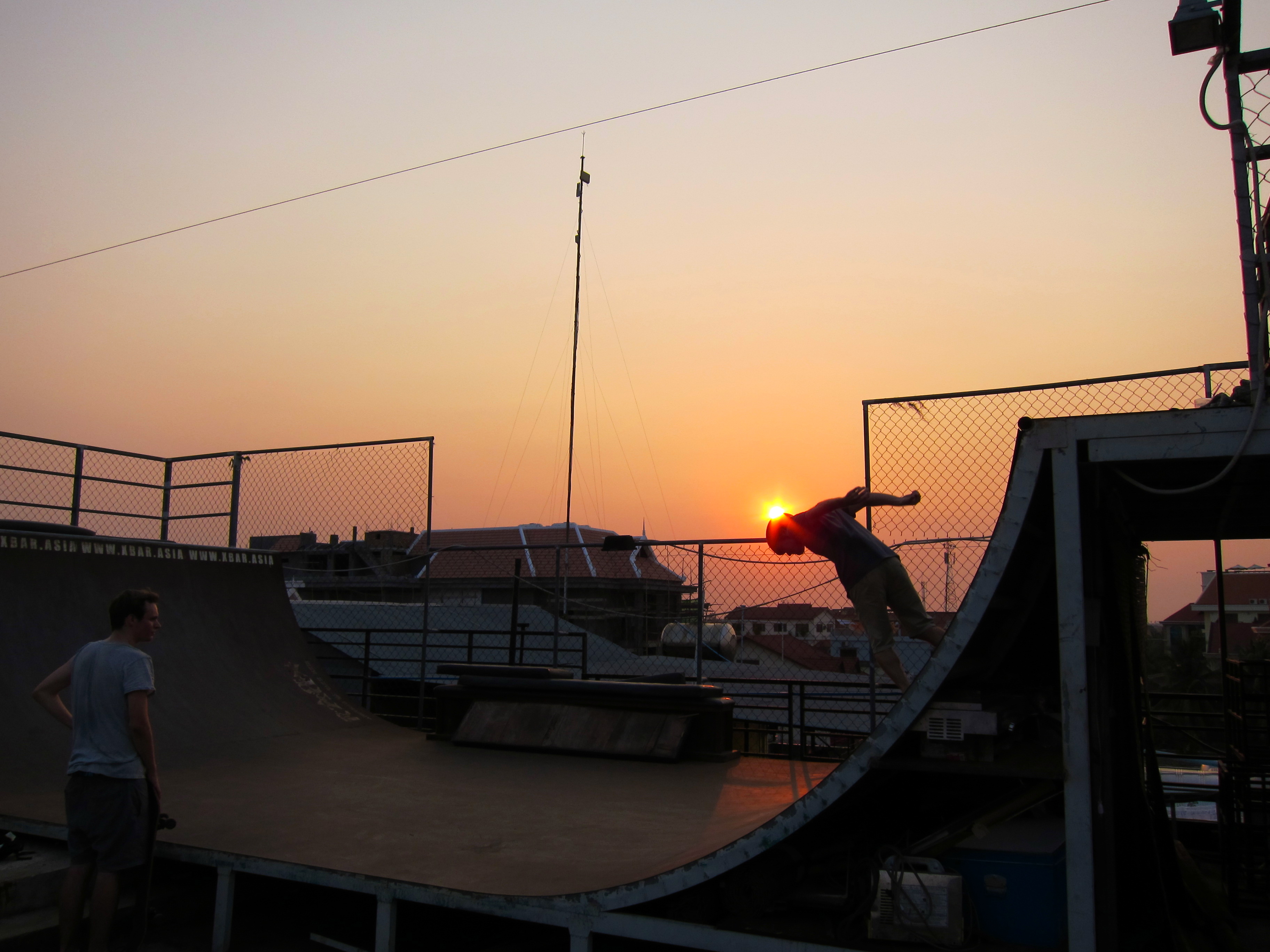 “X Bar” had a roof-deck skateboard ramp that Scott would use, prime for watching the sun go down over Angkor Wat.