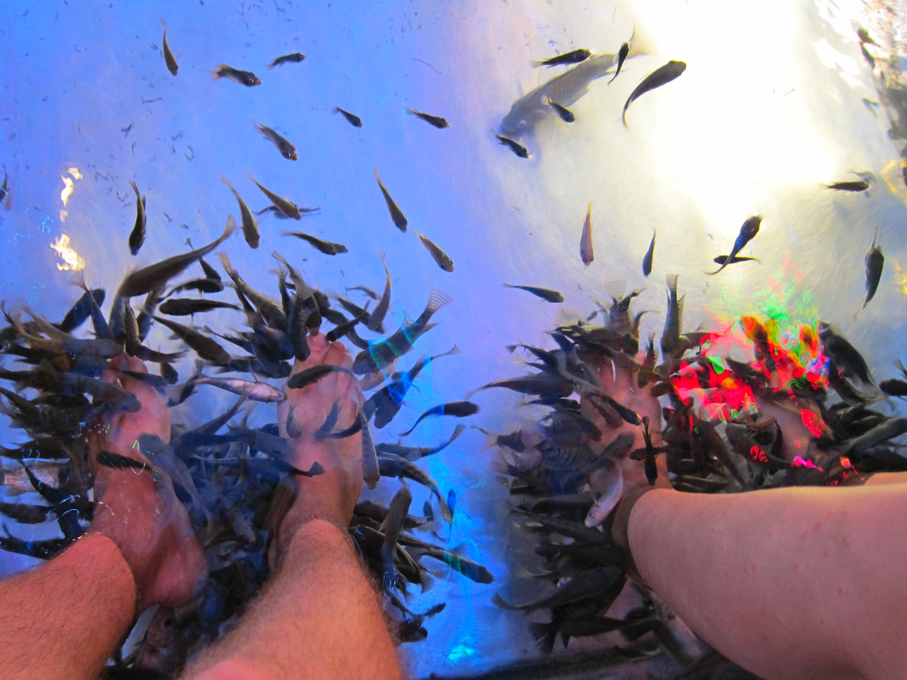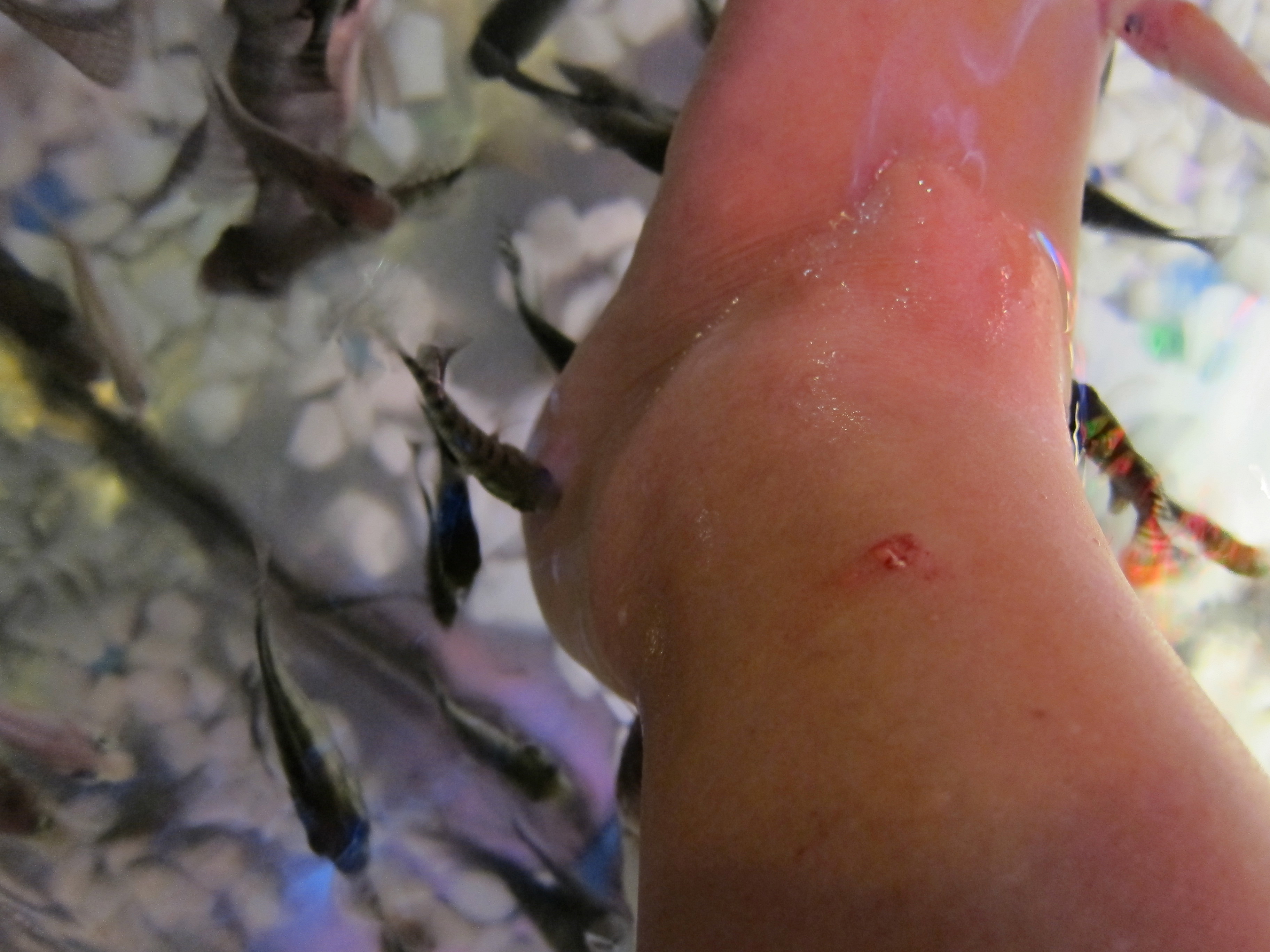 I love, love, love the fish spas. At first it was something that I tried just for kicks, but once I realized how good it made my feet feel, I was hooked. That is, until this booger actually bit my ankle and left me bleeding down my leg!!!