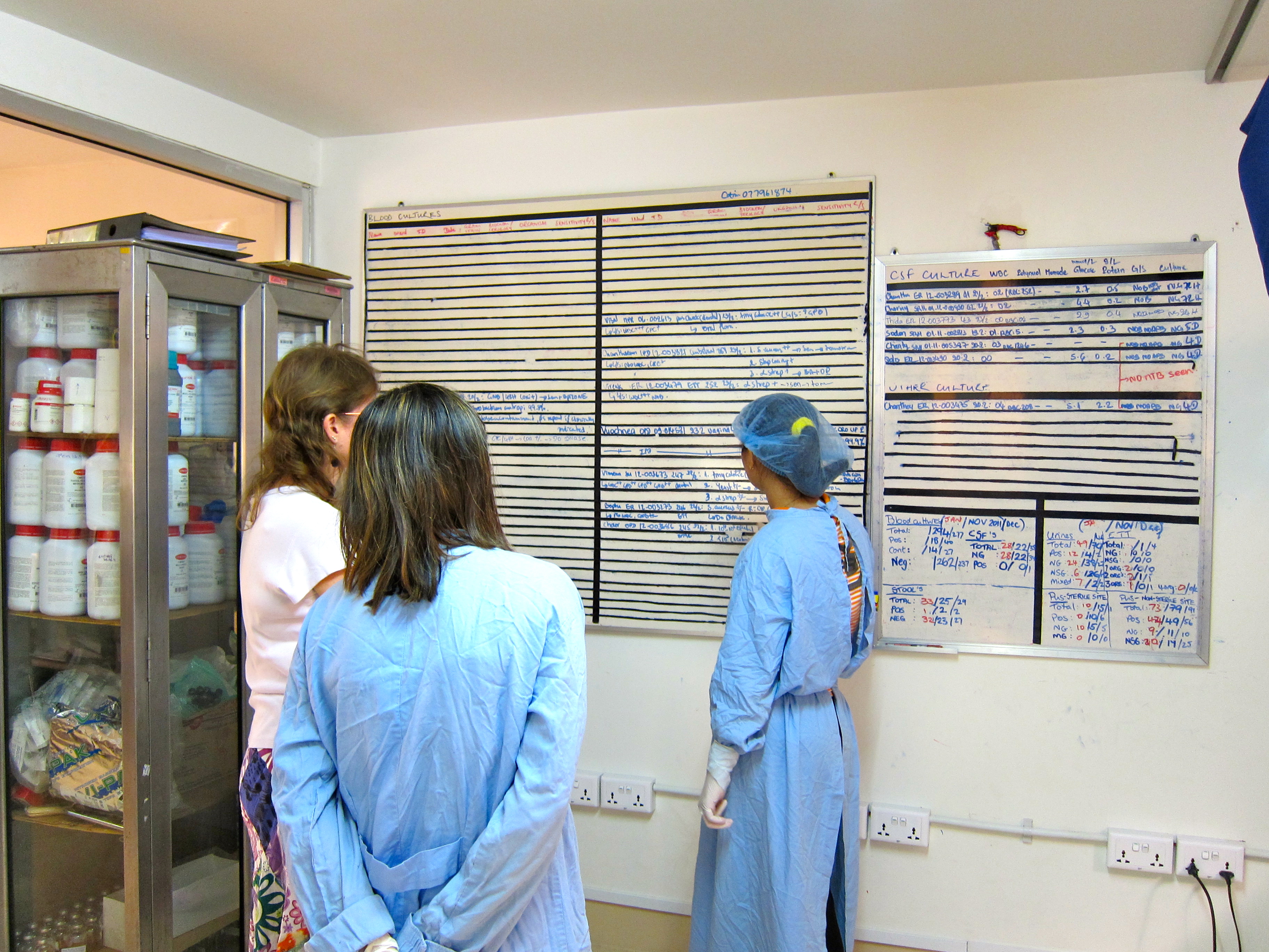 All of our results are written on a large board, which we review with the resident doctor around 11am each morning.