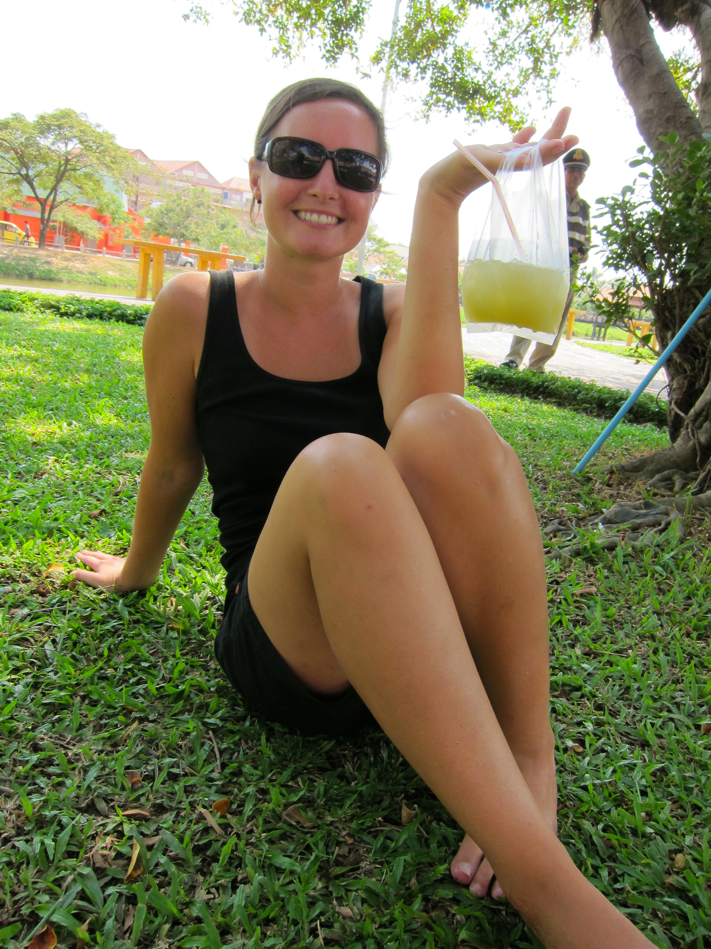 At lunchtime, Scott usually braves the 100+ degree heat to meet me at the hospital for my lunch-break. We generally skip eating (because the breakfasts are so filling) and instead enjoy a fresh-pressed palm-sugar drink from my favorite drink vendor, while hanging out by the river (in a take-away plastic baggy for just 12.5 cents, these little drinks can’t be beat!):