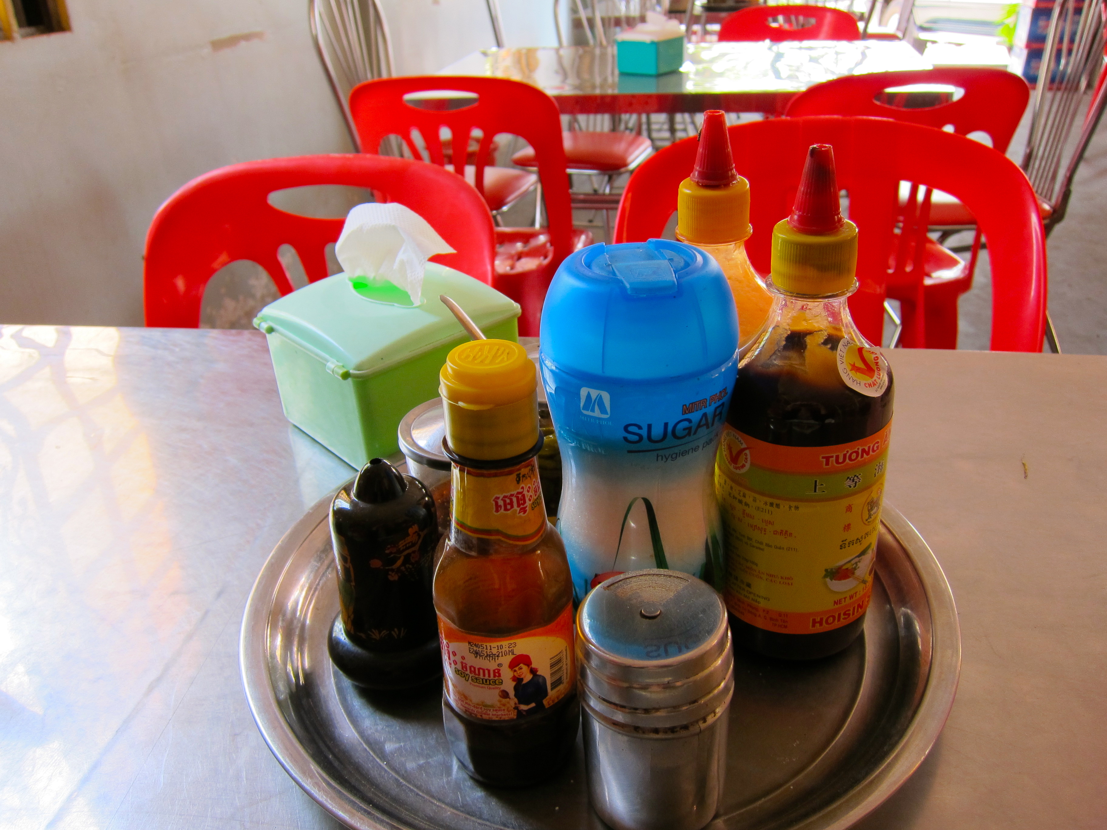 [The requisite tray of condiments to season your soup to your liking: green chilies, pepper, sugar, salt, hoisin sauce, soy sauce, red chili paste: