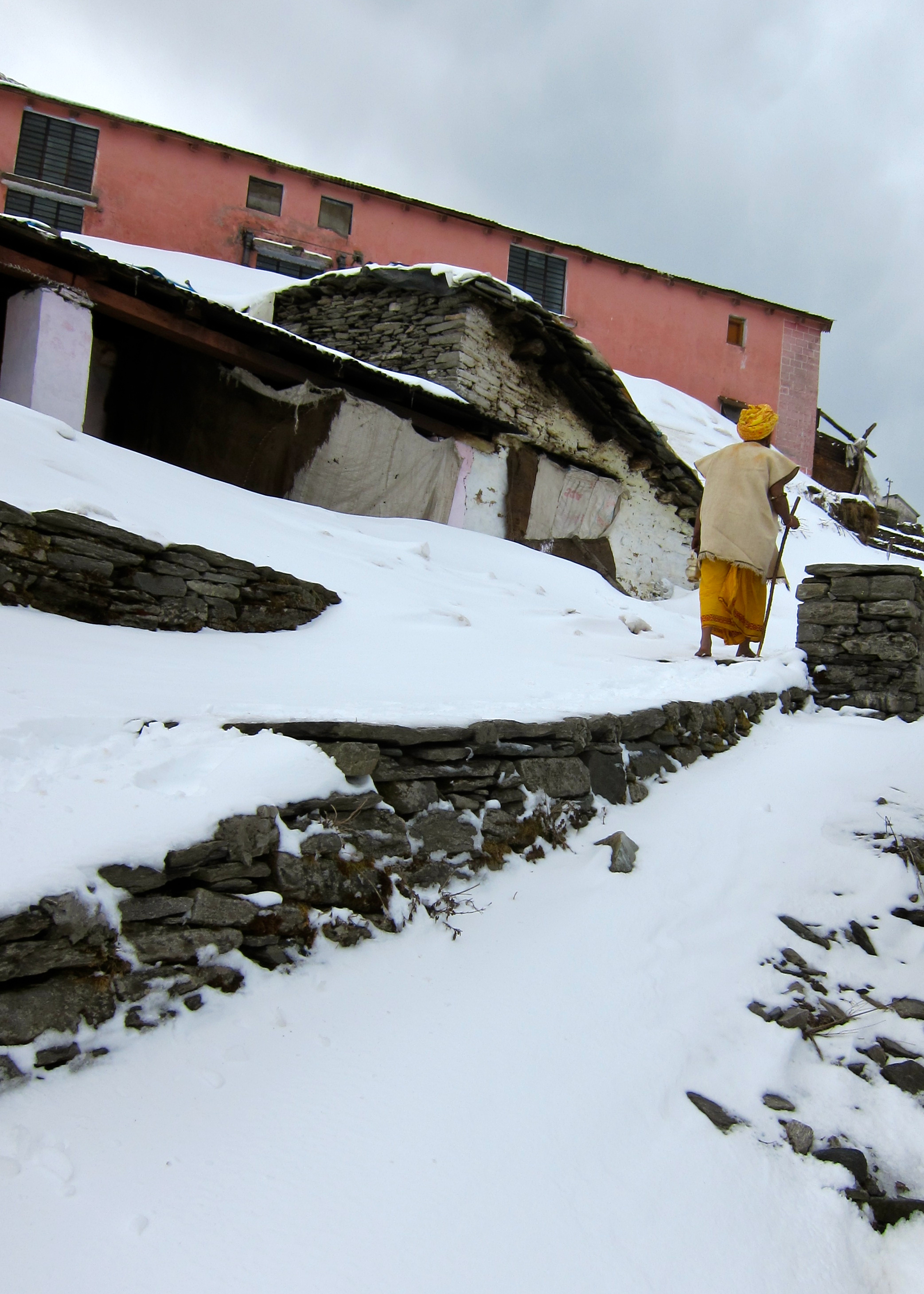 Having a look at his mobile was the least we could do to thank him, so Scott followed him back inside the cave. Scott found the charger properly plugged into the solar panel that we had seen sitting outside of the cave, but he instantly figured out (from our past week in freezing Chopta) that the phone battery was simply too cold to charge properly. Scott rubbed the battery in his hands for a few minutes, and voila! It started working. The baba was grateful.