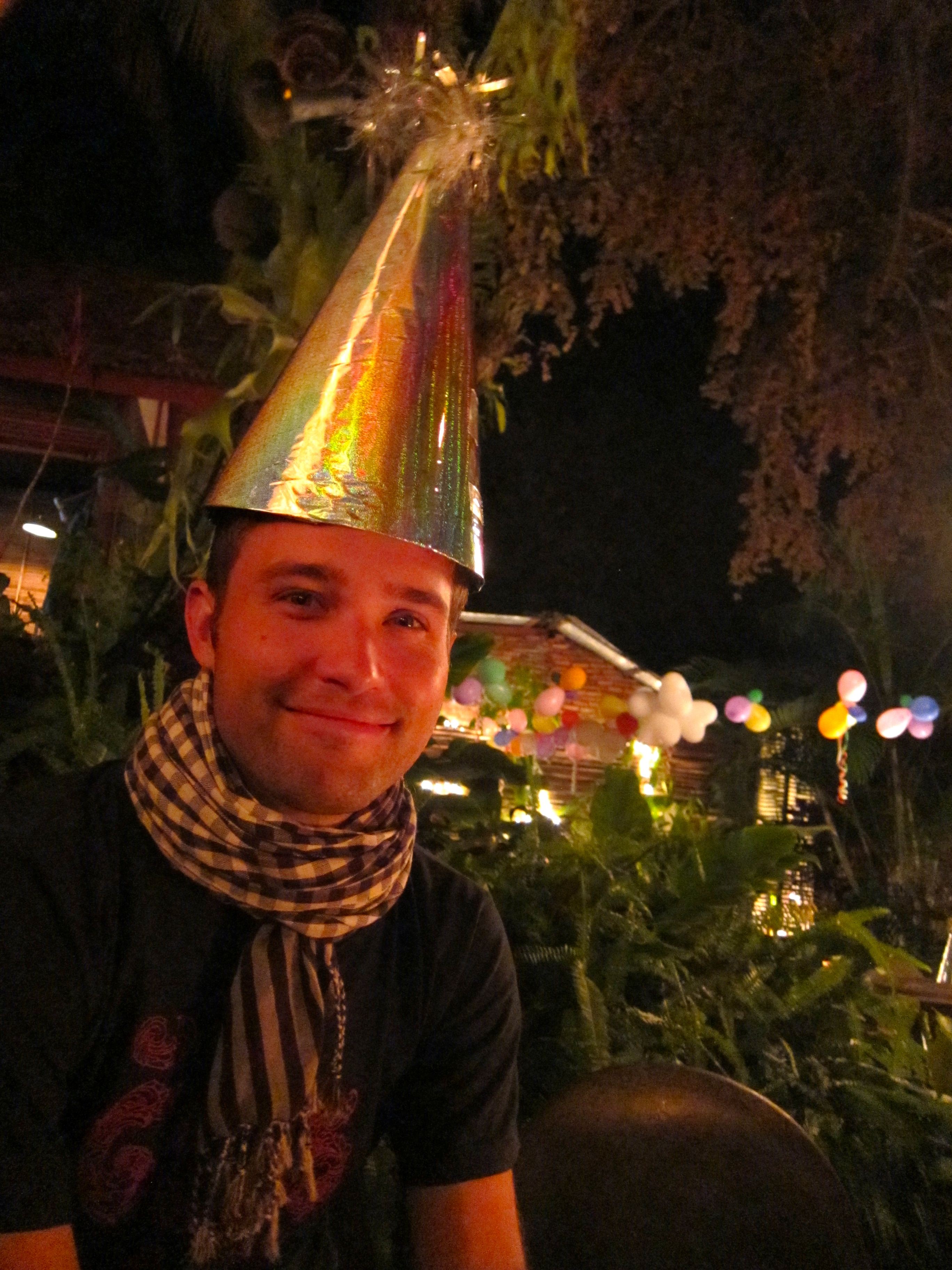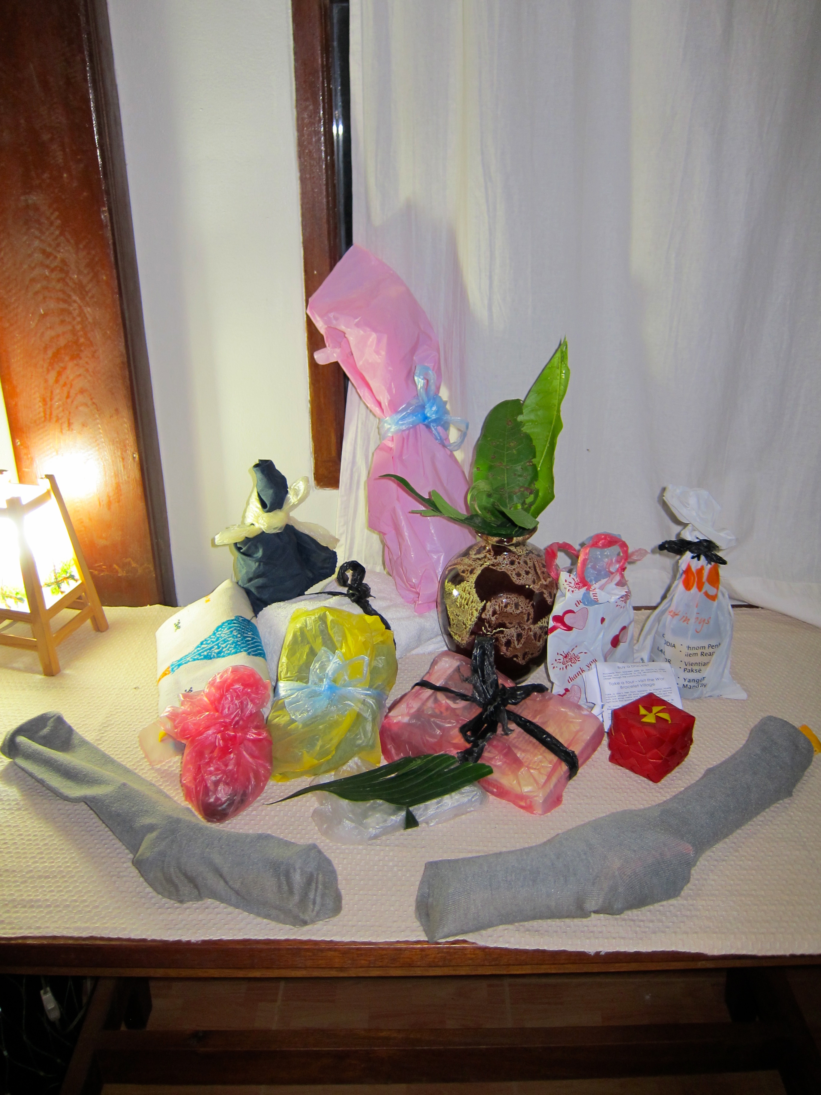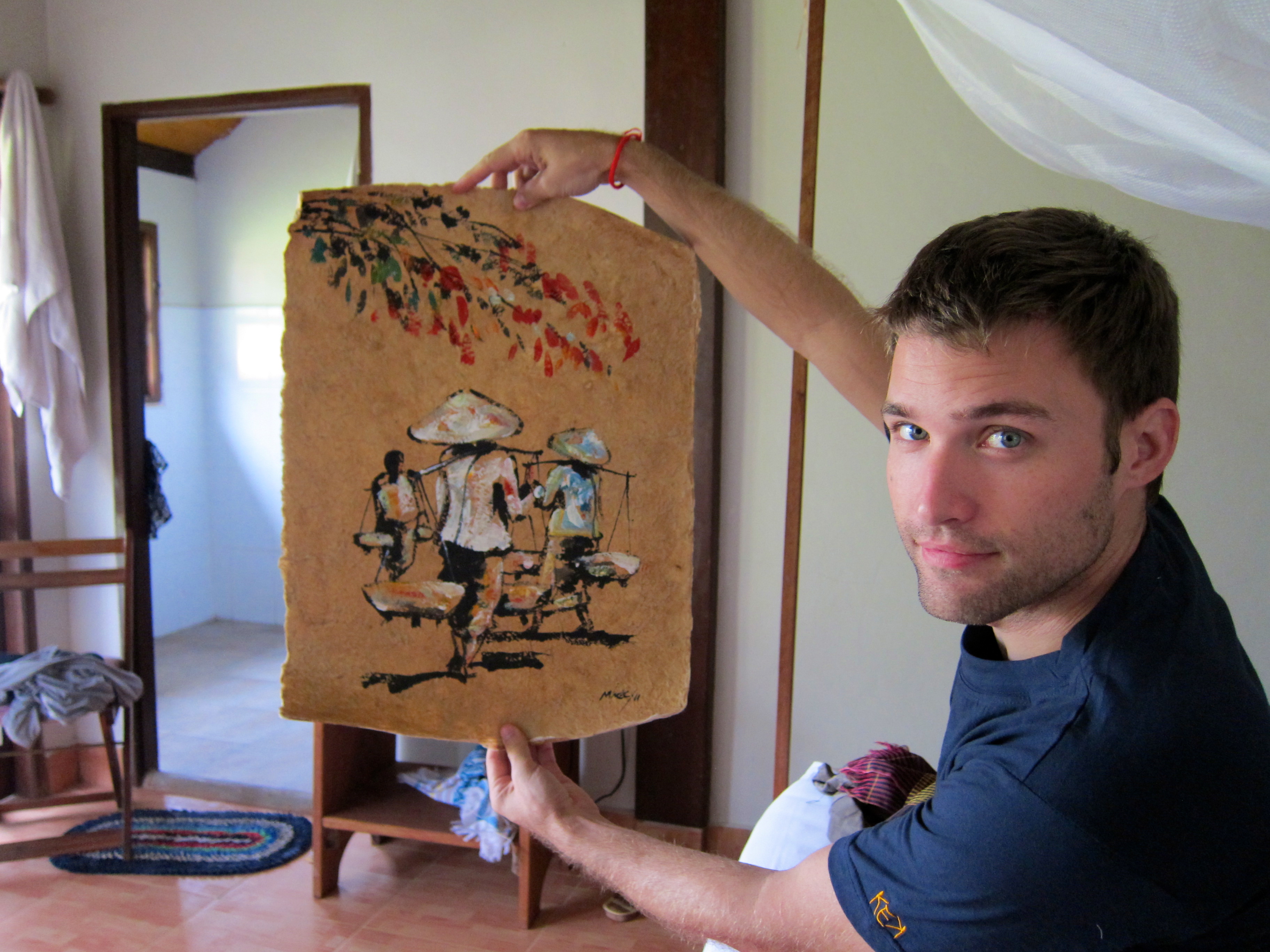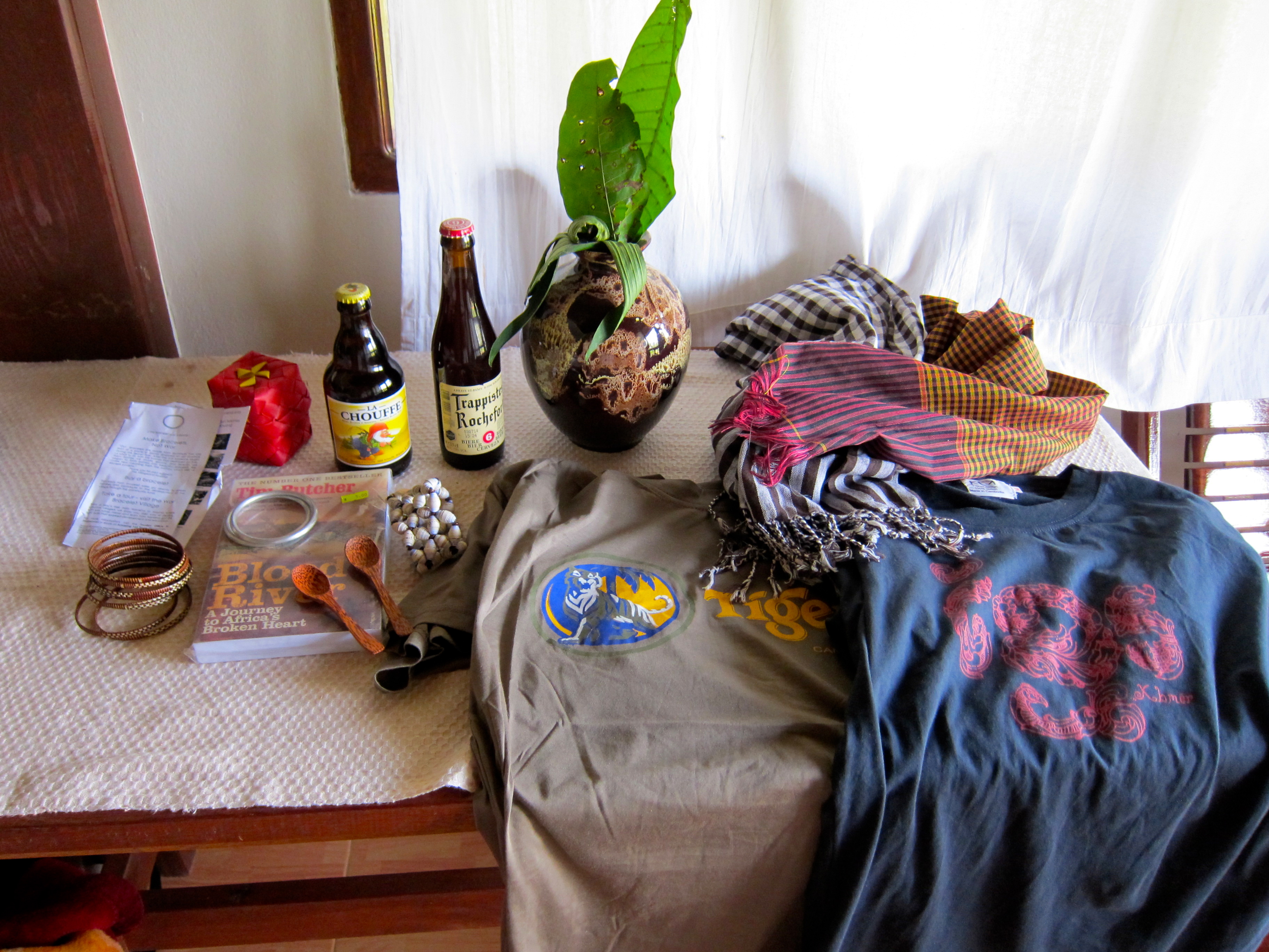 From Scott, I got a book called Blood River about a guy who traverses the Congo (very interesting so far), some aluminum bracelets made of melted down U.S. bombs from the Vietnam War (the village that makes them collects the scrap metal and makes spoons and bracelets out of it for income – more on that later), some woven bamboo and paper bracelets, and a La Chouffe beer (it’s incredibly difficult to find really good beer here – we had carried these all the way from Vientiane)! Scott got some T-shirts, a Cambodian krama (traditional scarf), some carved spoons for cooking back home, and a painting on mulch paper.