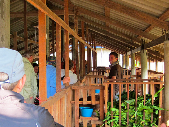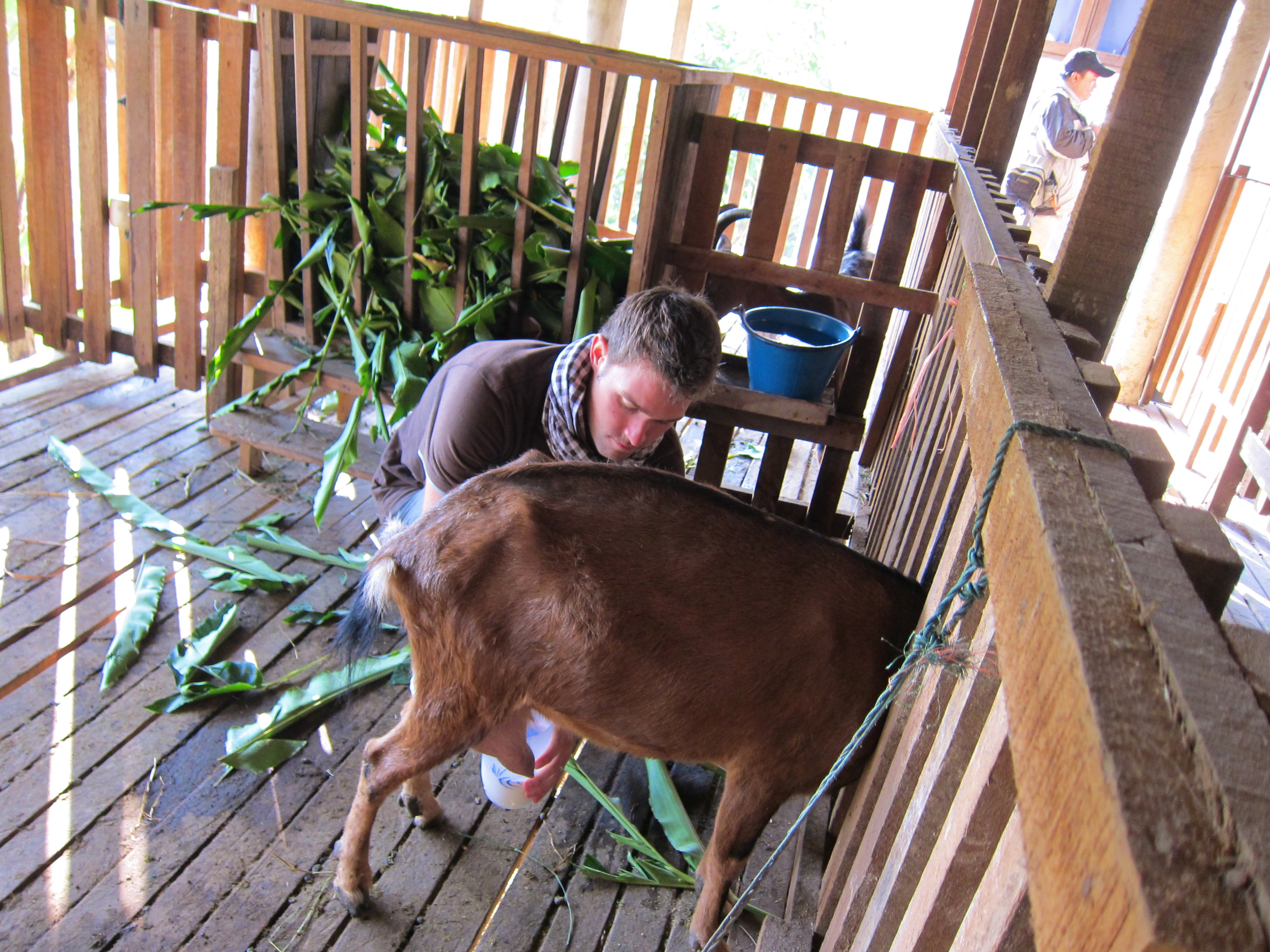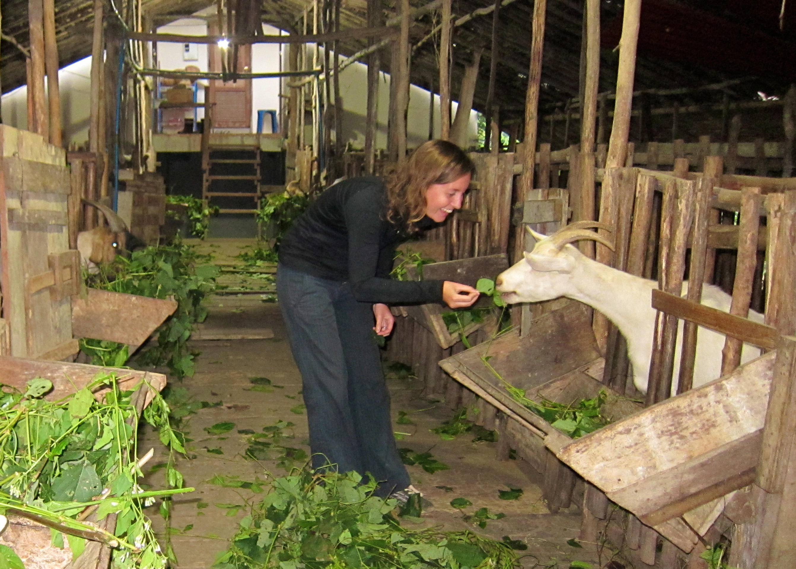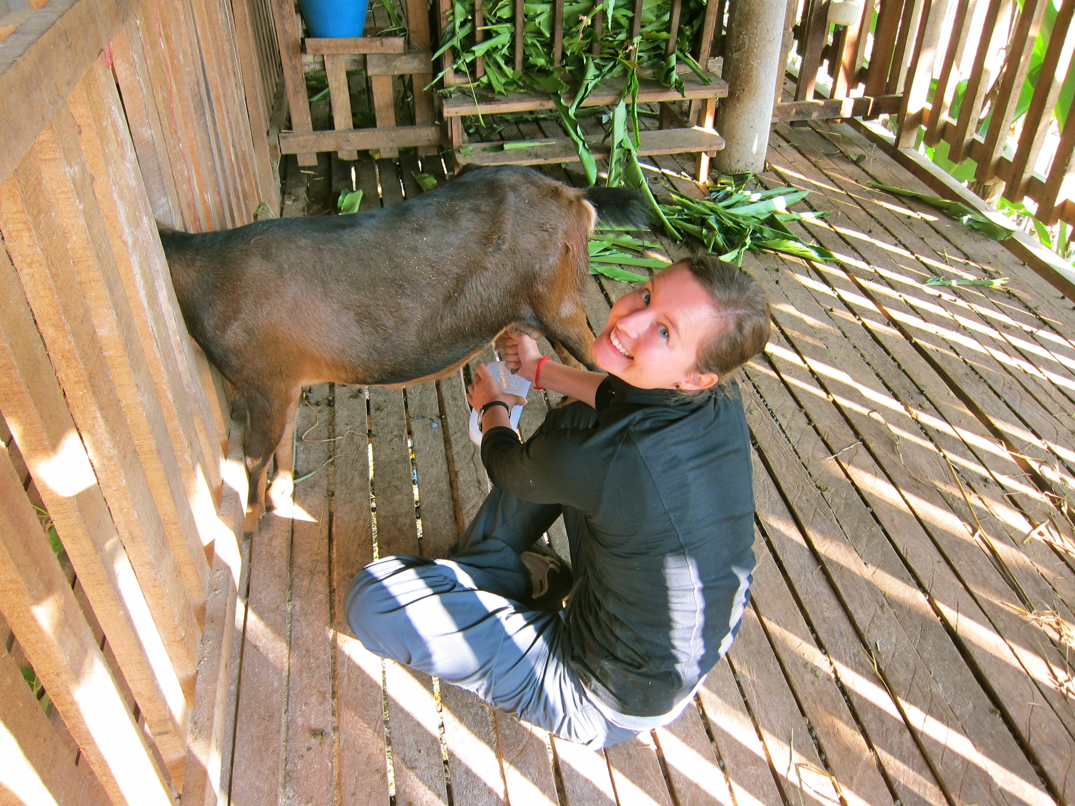 The funniest part of the whole goat experience was that we were working alongside a local man named Pai, the head farmer, who did not speak any English (and we speak almost no Lao), meaning we never quite knew if we were doing anything correctly. One day without warning, Pai flung open the gates to the goat pen, causing about 20 goats to come stampeding toward us. Apparently we were supposed to try to herd them into their individual pens at that point, but our presence just ended up causing them to scatter into the surrounding bushes. After some confusion, we eventually figured out where Pai wanted us to herd them. Scott chasing goats into the barn: