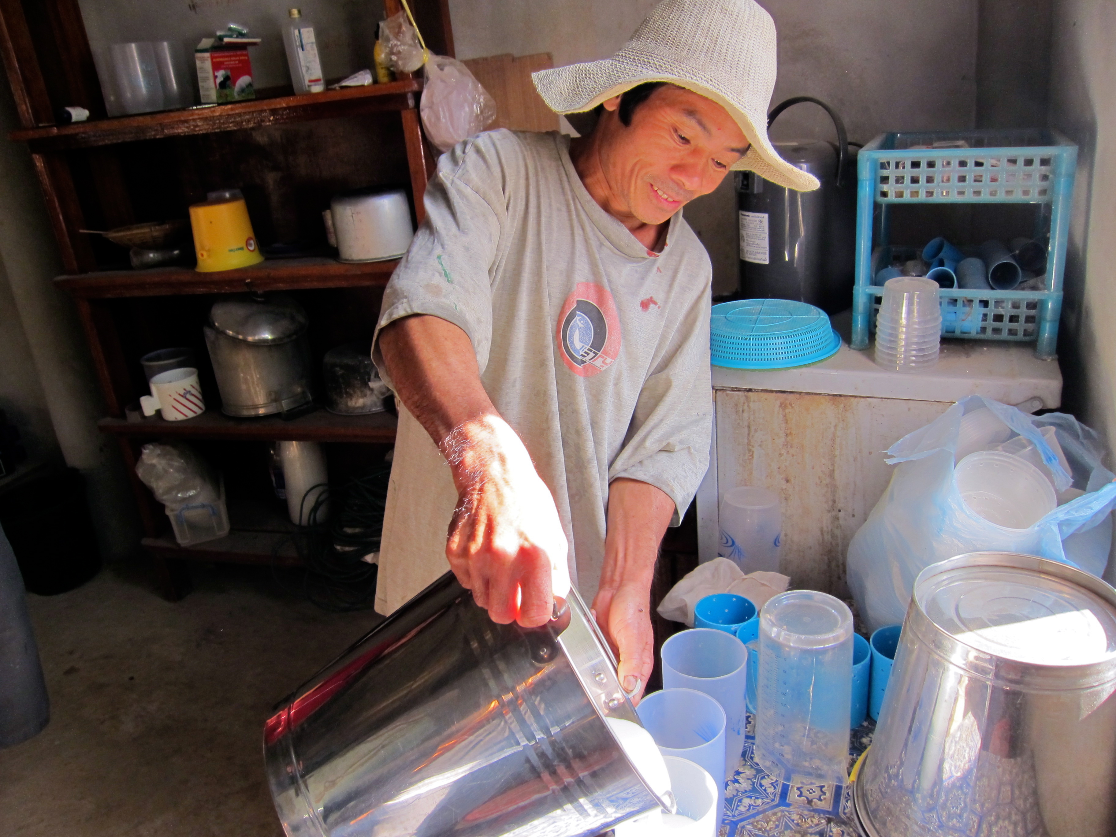 Afterwards, Pai showed us how to make goat cheese out of the milk, which involved stirring the whey from the previous day’s cheese into the fresh milk and then setting the mixture at room temperature in the goat barn for 24 hours. Essentially, the cheese that you eat at the farm is unpasteurized, untreated, and completely dependent on how safe the volunteer or farm staff were on the day they made the cheese. (God help anyone who ate the cheese that we made, as Scott accidently dipped a goat teat directly into the milk while he was milking his goat! Eek!) Luckily, everyday that we ate the cheese (which was definitely every single day – it was delicious), the cheese was wonderful and we never felt sick.