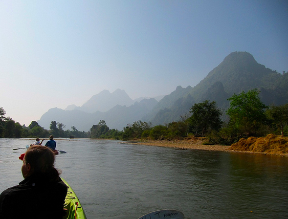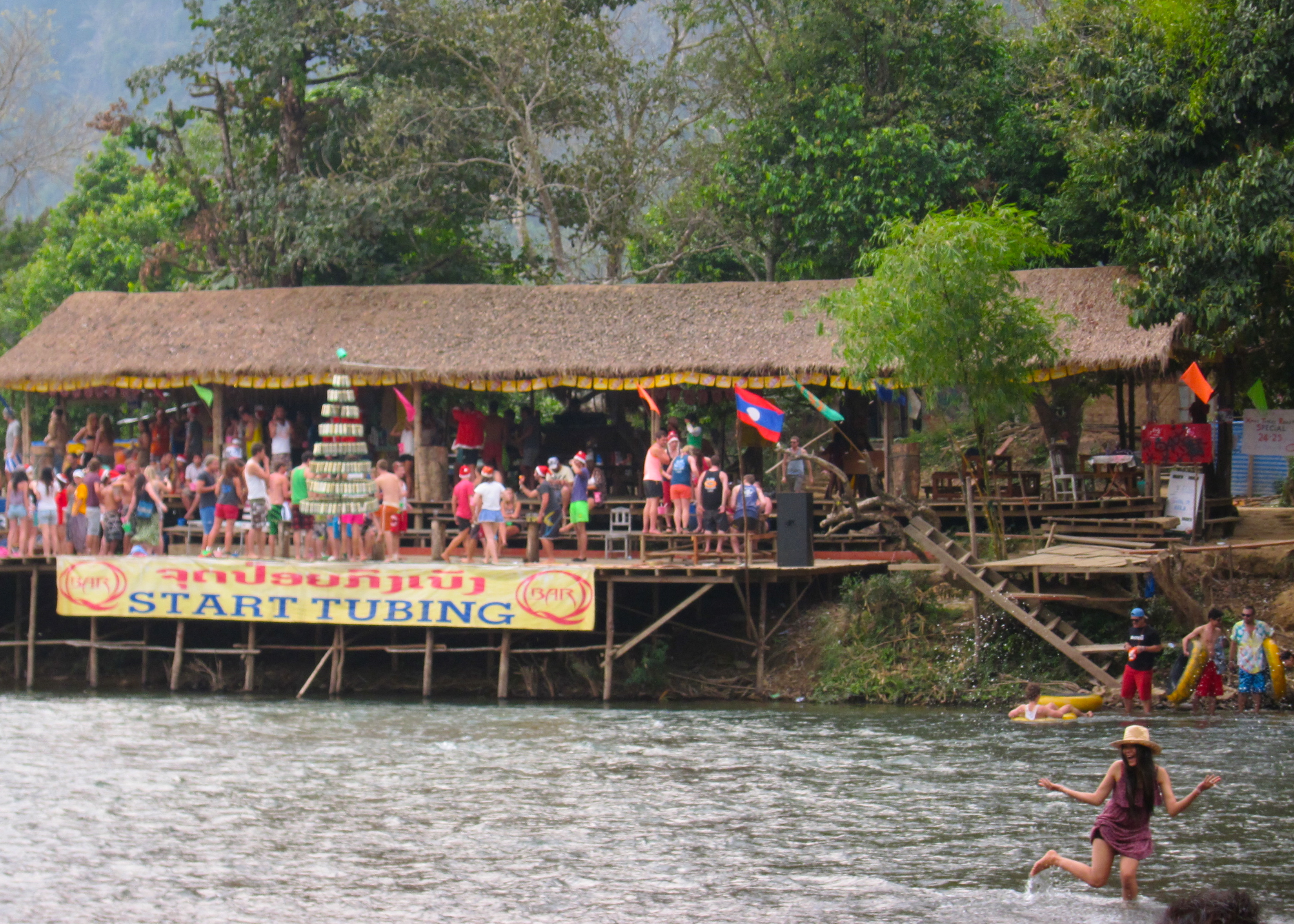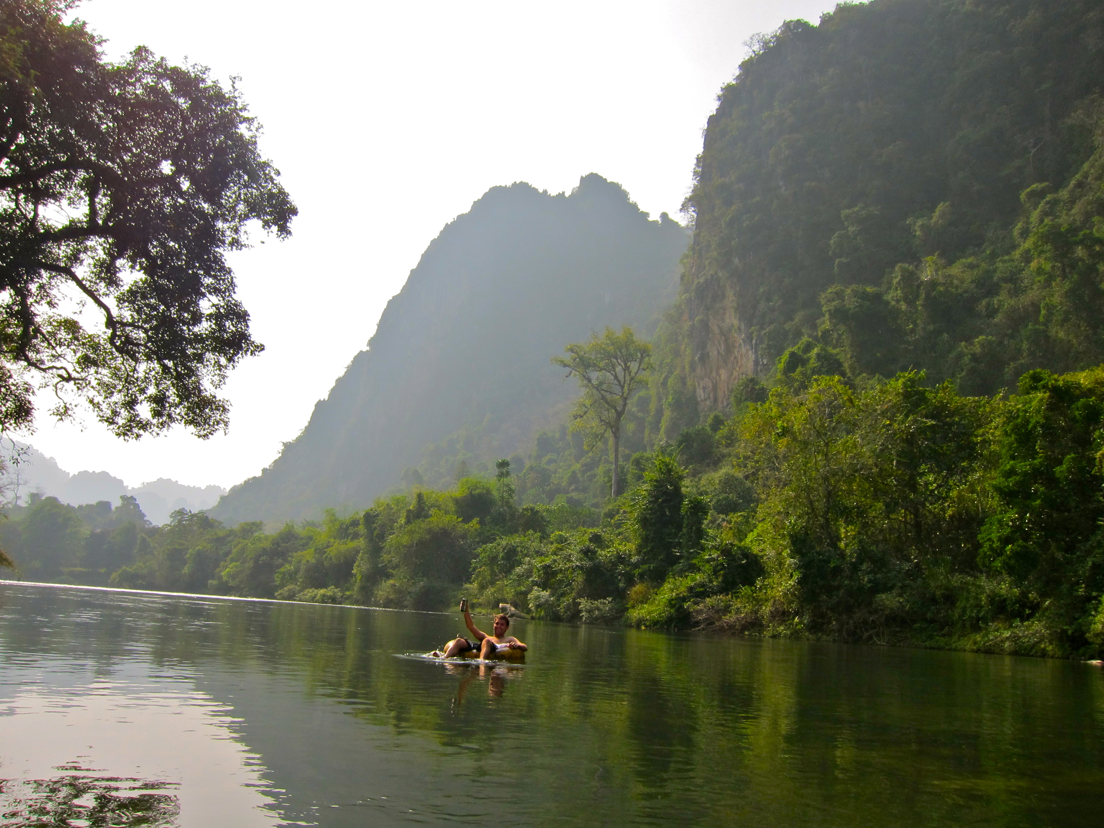 Vang Vieng: impossibly lush, gorgeous stretches of crisp, winding river; towering jungle-clad mountains that make one contemplate the meaning of life; some a**hole in neon swim trunks, sipping Lao Lao from a plastic bucket, urinating off a nearby dock.