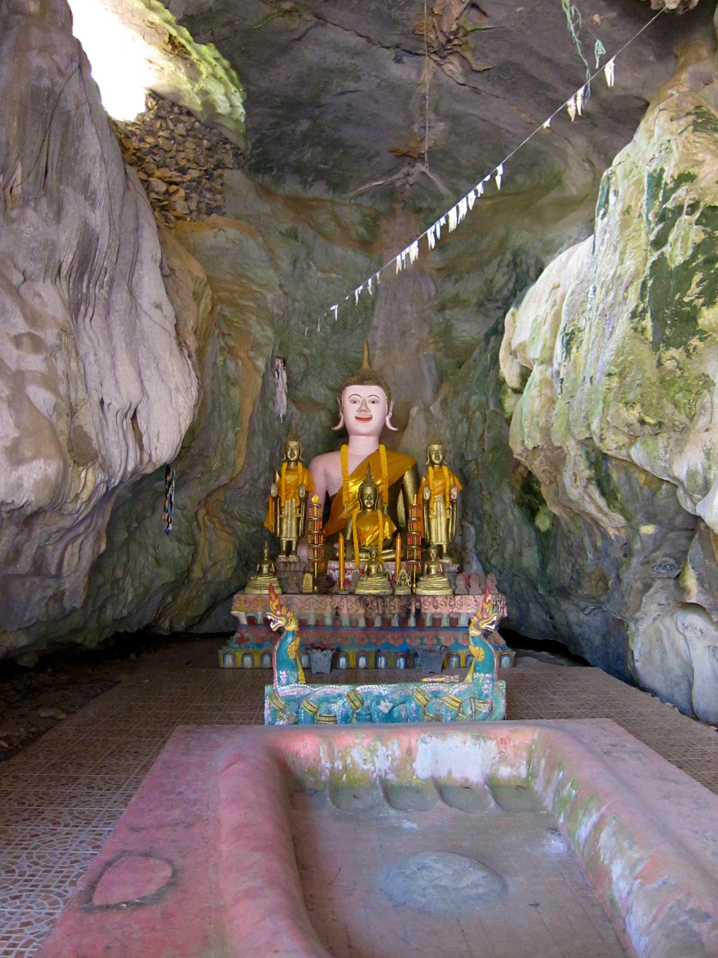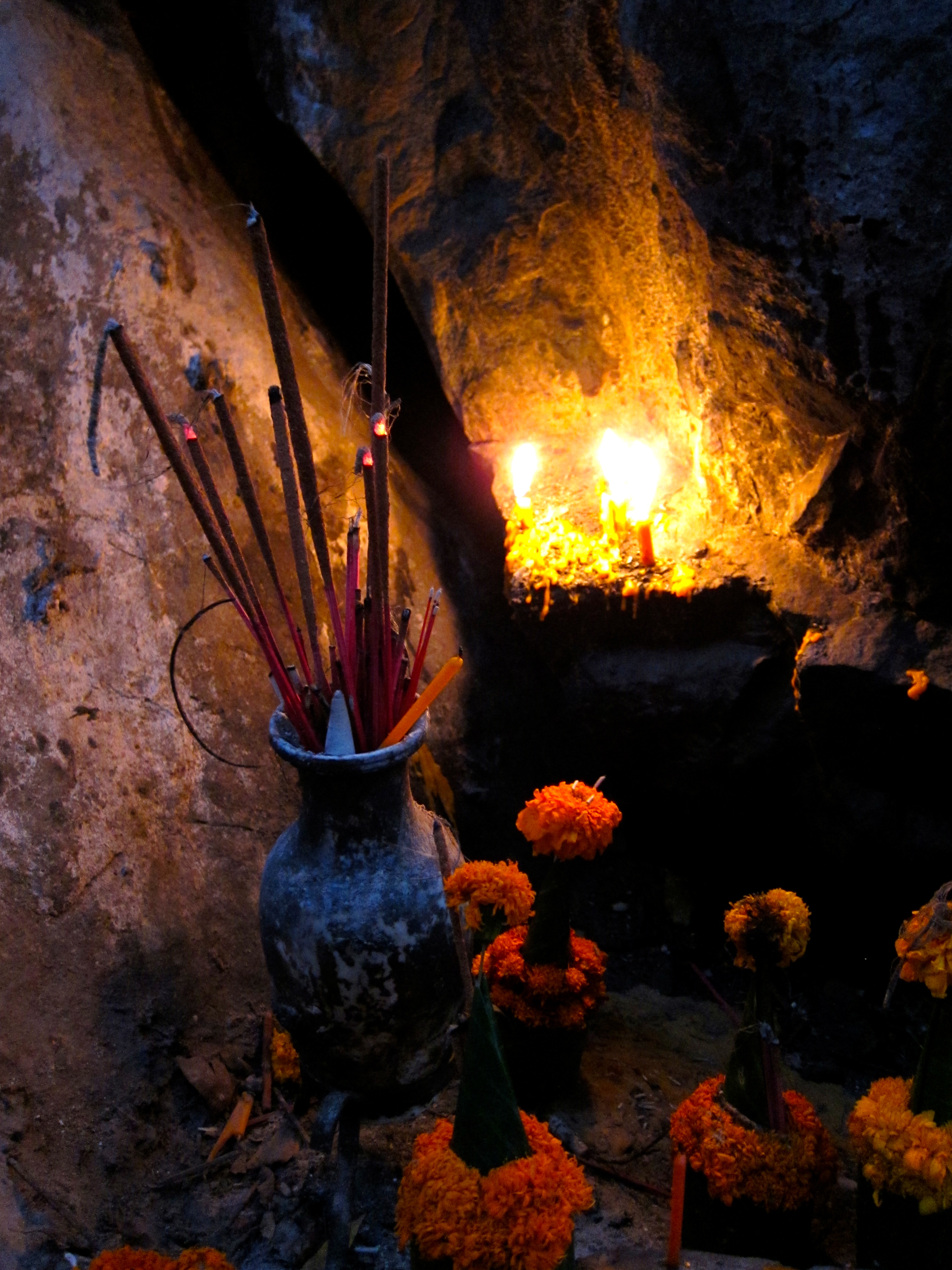 Luckily, the next cave, The Elephant Cave, was much warmer and easier to explore. It was a cave that doubles as a temple for the local Lao people in the area, who could not afford to build a temple. The cave got its name from a natural stone structure inside the cave that looks oddly like an elephant from one angle (oddly, today it looks very much like an elephant from every angle, and the rumor is that is has been doctored by not-so-natural means). (We did not capture a picture of the so-called “natural” elephant.)